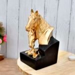 Horse head showpiece will be an enchanting home dcor object. The hand-carved horse head Polyresin showpiece involves an exquisite design and chiseled texture to give a graceful look to your home. The showpiece for home decor is out of the ordinary and unique showpiece for home decor. The stunning horse head figurine is an ideal showpiece for the living room, bedroom, drawing room, desktop, TV cabinet, and so on. The polyresin showpiece is a great gift for weddings, anniversaries, housewarmings, birthdays, Christmas, festivals, and others. Note : The Horse Head showpiece can be matched with other decorative objects from our collection to have an abstract decor setup.